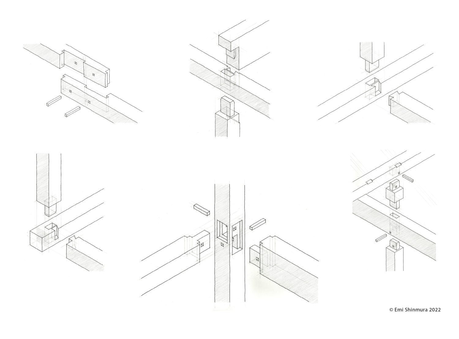A collection of axonometric drawings of typical Japanese carpentry joints, first published in 2021 in an annotated article in Fine Woodworking Magazine. Emi embraces design through her woodworking background having spent time timber-framing with her traditionally trained carpenter aunt in Japan and from childhood experiences with her instrument-maker grandfather in the UK.